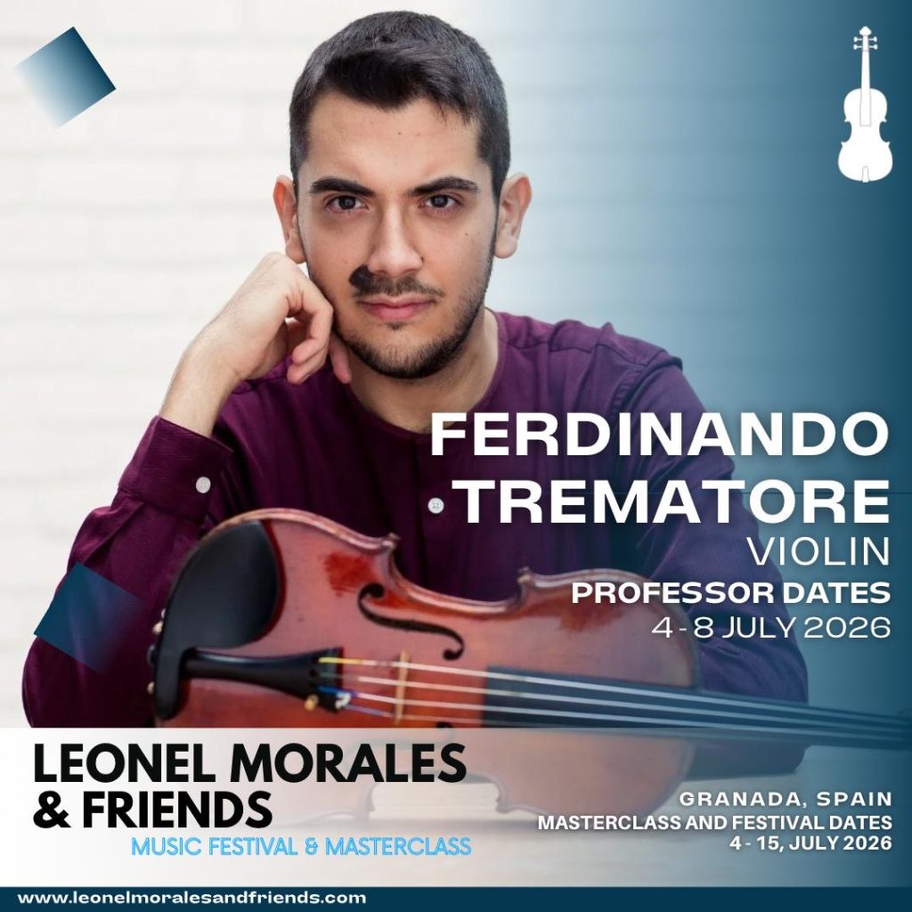 Se comunica que Ferdinando Trematore formará parte del profesorado de violín del Curso de Música organizado por Leonel Morales & Friends, que se celebrará en Granada en julio de 2026. El curso ofrece a los participantes clases individuales, acceso como oyentes a las clases magistrales, asistencia a los conciertos del festival y certificado acreditativo de participación, en el marco de una propuesta formativa de alto nivel artístico y pedagógico.